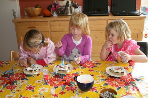 En als de dames zijn gearriveerd, de jurken bewonderd en de kadootjes uitgepakt, gaan we met elkaar de snoephuisjes versieren en opsmikkelen! Tijdens het koek eten leest mama het sprookje van Hans en Grietje voor.