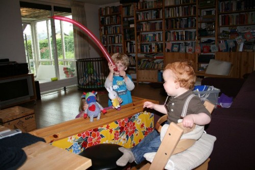Bette en Jan houden een poppenvoorstelling voor Gijs.